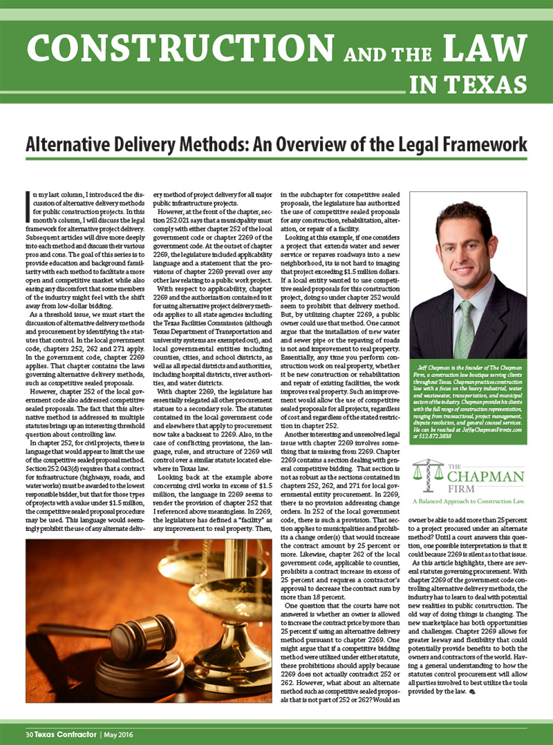 In my last column, I introduced the discussion of alternative delivery methods for public construction projects. In this month’s column, I will discuss the legal framework for alternative project delivery.