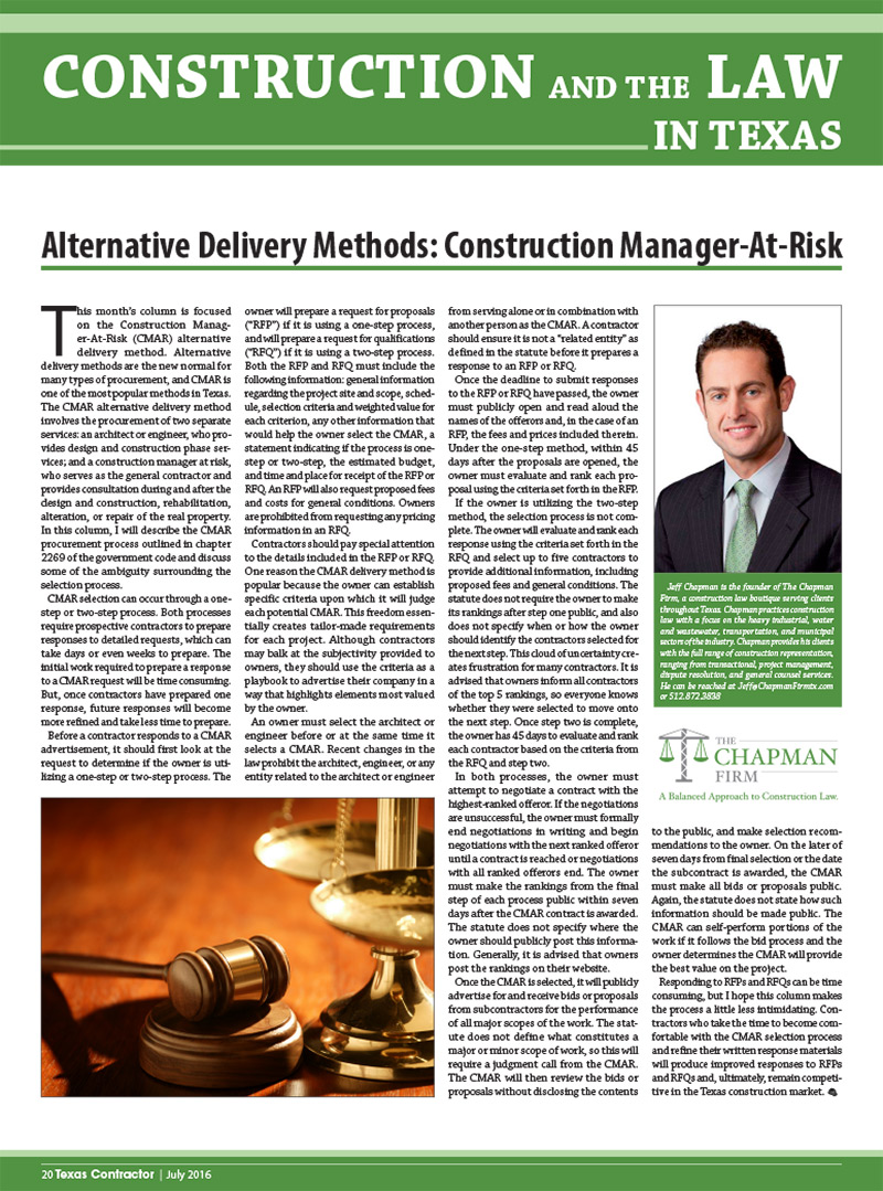 This month’s column is focused on the Construction Manager-At-Risk (CMAR) alternative delivery method. Alternative delivery methods are the new normal for many types of procurement, and CMAR is one of the most popular in Texas.