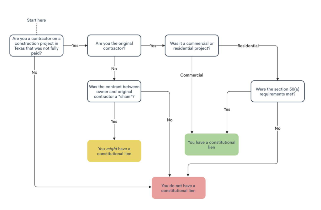 The policy behind the constitutional lien is that the owner already knows that you, the original contractor, were not paid because they have a contract with you. That knowledge does not exist if the owner does not have a contract with you. For example, if you are a subcontractor that contracted with the original contractor and the original contractor fails to pay, you cannot file a constitutional lien because it cannot be presumed that the owner knows you were not paid.
