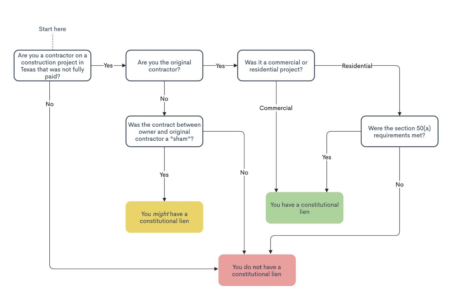 In addition to the statutory lien, the Texas Constitution provides another mechanism for a mechanic’s lien that is available to Texas contractors, aptly called the constitutional lien. Constitutional liens, unlike statutory liens, are automatic in that they are self-executing. Critically, depending on your status (i.e., are you an original contractor or a subcontractor?) and the type of project (i.e., residential or non-residential), the requirements for a constitutional lien change and affect whether a constitutional lien has self-executed (or whether it is even available).