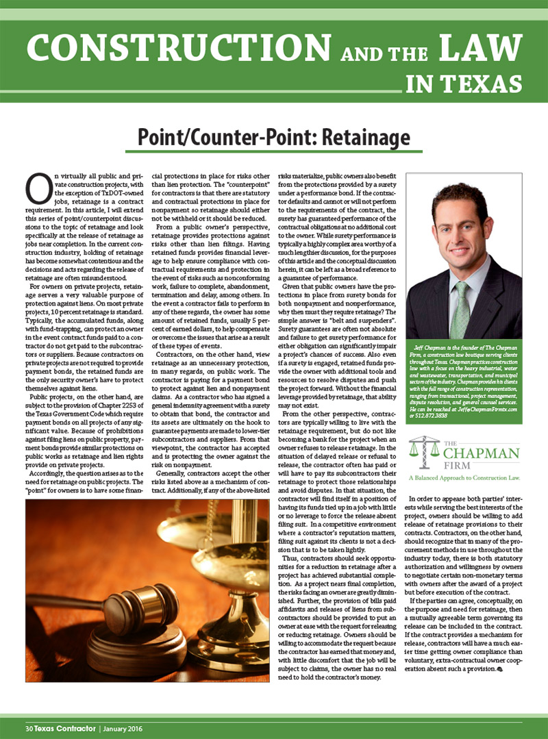 In virtually all public and private construction projects, with the exception of TxDOT-owned jobs, retainage is a contract requirement. In this article, I will extend this series of point/counterpoint discussions to the topic of retainage and look specifically at the release of retainage as jobs near completion.