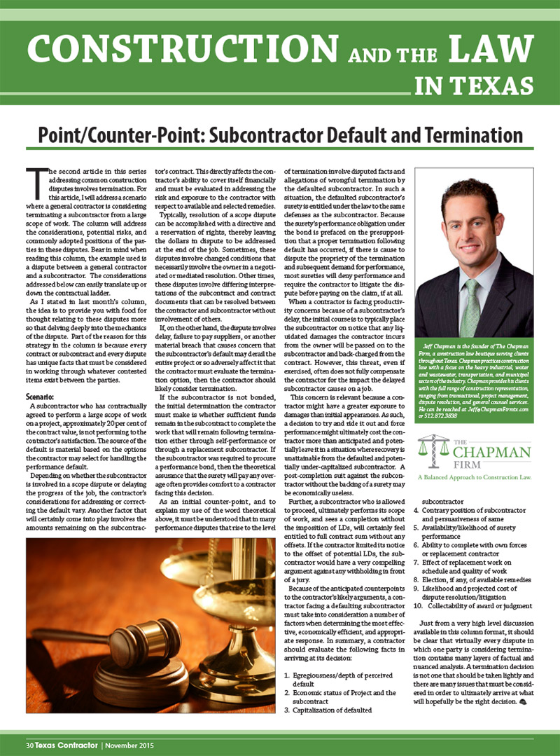 The second article in this series addressing common construction disputes involves termination. For this article, I will address a scenario where a general contractor is considering terminating a subcontractor from a large scope of work.