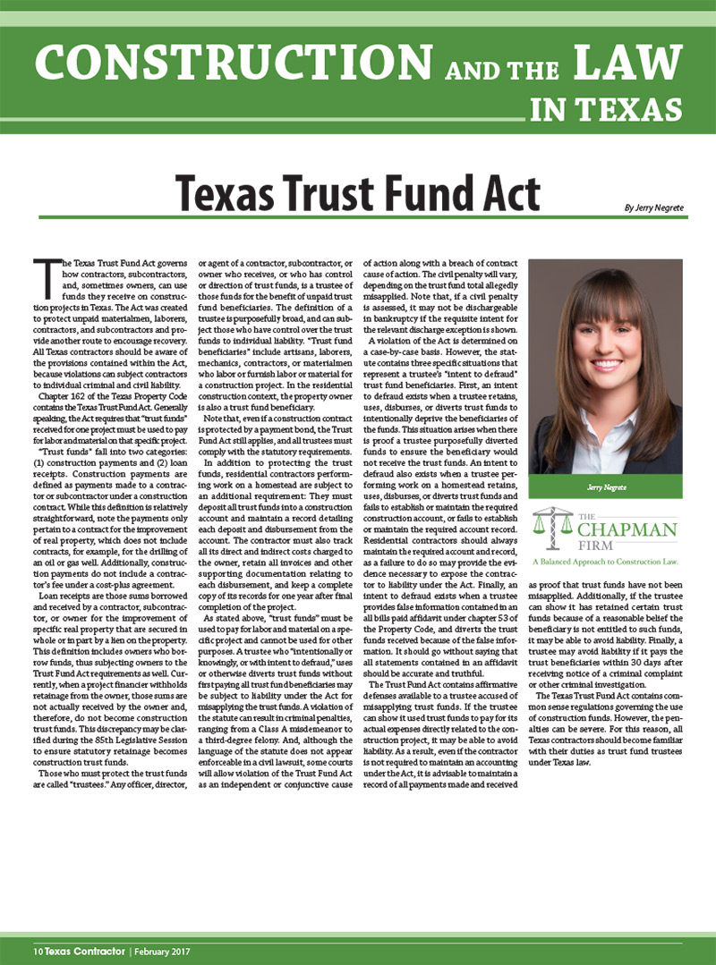 The Texas Trust Fund Act governs how contractors, subcontractors, and, sometimes owners, can use funds they receive on construction projects in Texas.