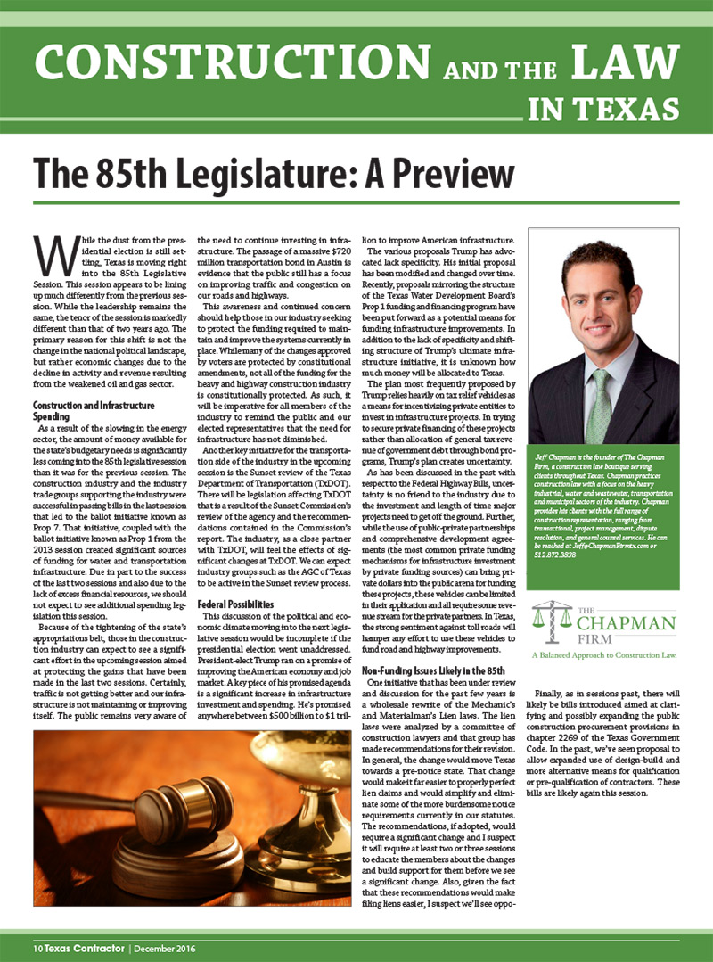 While the dust from the presidential election is still settling, Texas is moving right into the 85th Legislative Session. Download the full article. Construction Law, Jeffrey Chapman, Publications|