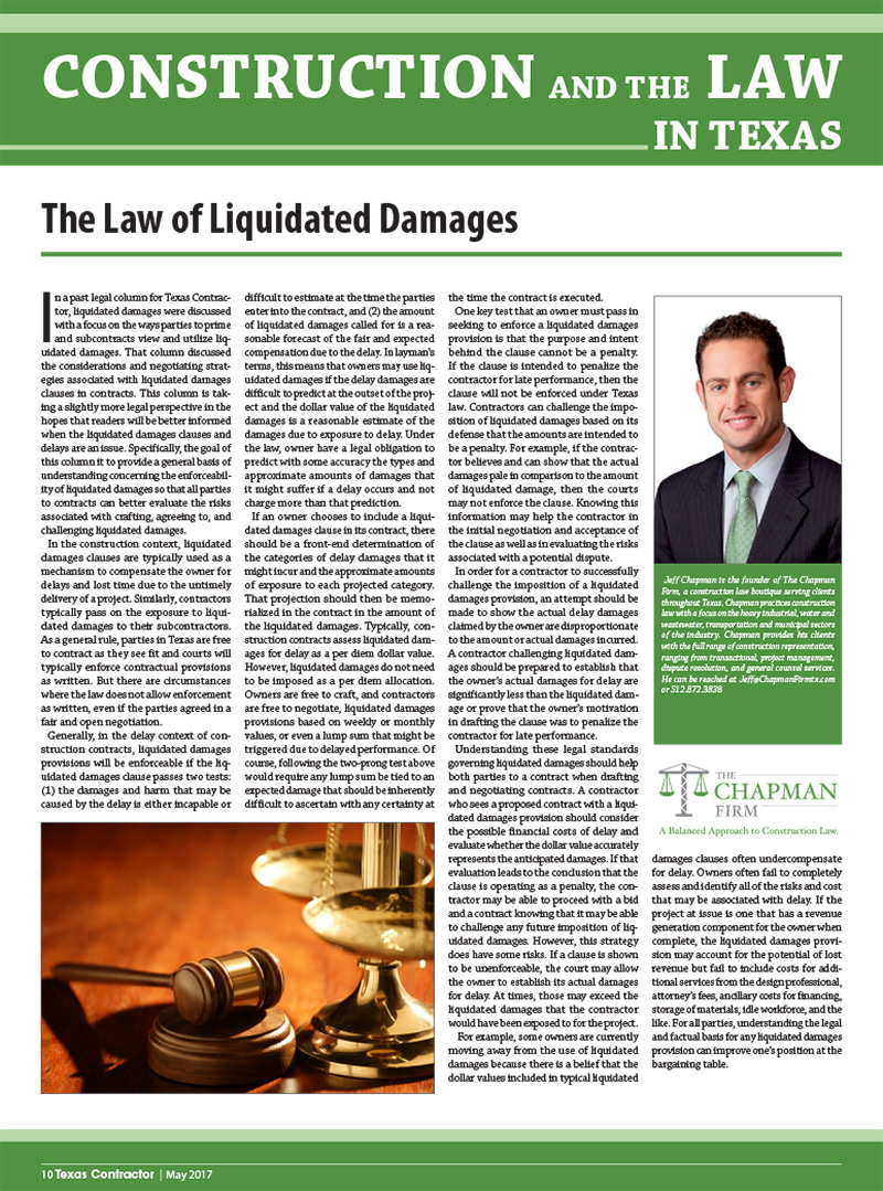 In a past legal column for Texas Contractor, liquidated damages were discussed with a focus on the ways parties to prime and subcontracts view and utilize liquidated damages. That column discussed the considerations and negotiating strategies associated with liquidated damages clauses in contracts.